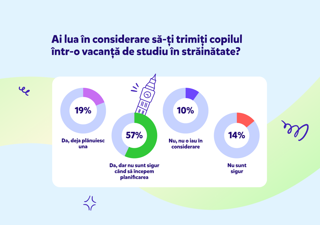 Potrivit sondajului amintit anterior, vacanțele de studiu în străinătate reprezintă o alternativă din ce în ce mai populară, luată în considerare de 57% dintre părinții români – însă fără a ști exact când să o planifice. Printre principalele aspecte care îi motivează pe adulți să îmbunătățească abilitățile de engleză ale copiilor se numără: dezvoltarea personală (62%), oportunitățile de angajare (60%) și șansa unei cariere internaționale (52%). Cât despre destinațiile favorite pentru astfel de experiențe formative, Marea Britanie (56%), SUA (28%) și Canada (12%) ocupă primele 3 poziții din topul respondenților.